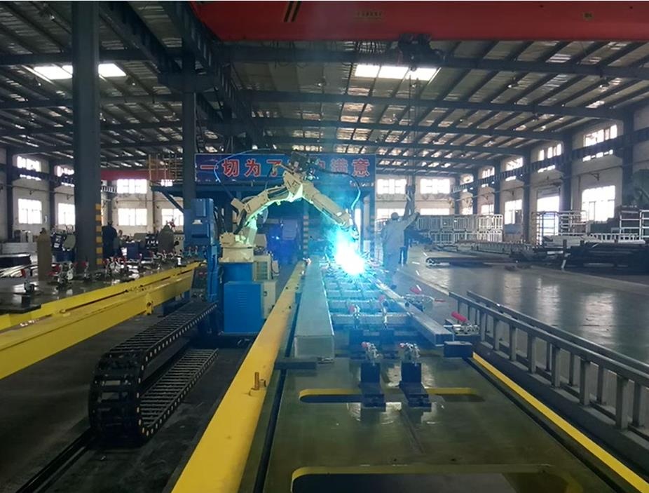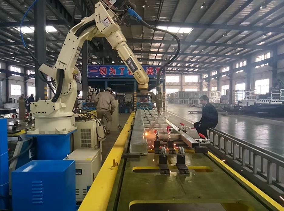 包含焊接機器人(包括機器人本體、數控逆變焊機、焊槍、防碰撞傳感器、送絲裝置、送絲機支架、焊絲盤支架、送絲管、變壓器)、外圍配套(包括焊接變位機、機器人外部行走軸、柔性化組對工裝、機器人安裝底座、管線包平衡架、清槍剪絲器、安全防護欄、控制系統等)。關鍵技術:
