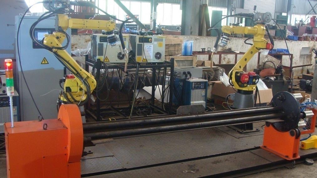 包含長臂焊接機器人、機器人安裝底座、單軸氣動變位機、兩軸伺服變位機、焊接工裝夾具(針對客戶工件進行設計制造)、機器人控制系統、機器人示教器、焊接電源、機器人專用焊槍、外部控制盒。