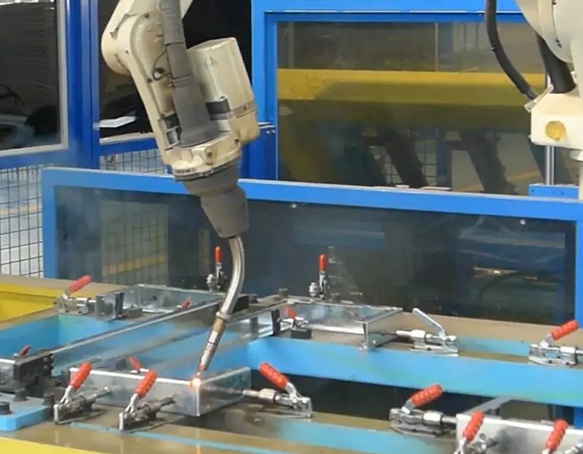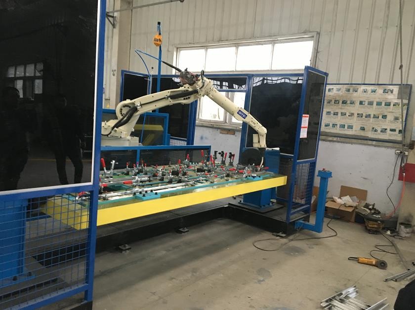 該工作站為制冷設備自動化焊接工作站,呈H型布局,適用于產品的大批量生產,且工件焊縫多、位置不集中類型的工件的焊接。充分利用機器人使用率,采用單機雙工位、2個單軸變位機,4臺夾具作業,充分保證節拍及焊接品質。工作站由人工上下料,機器人自動化焊接,效率較之前提高了3倍。工件焊縫均勻,產品補焊率低,產品質量整體提升。