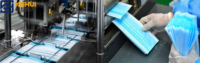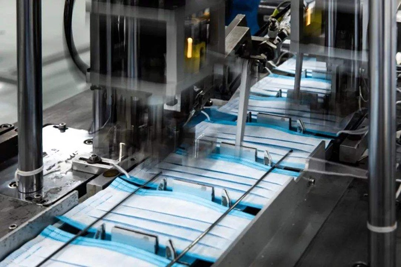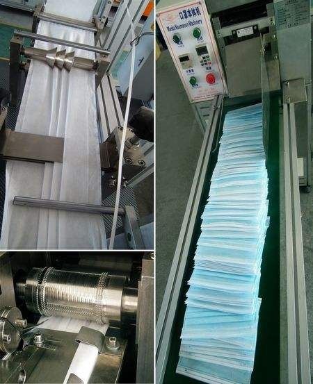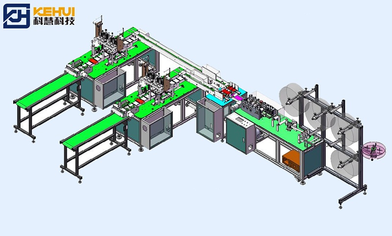 工序流程:上布-送布-鼻梁支架安裝-折邊-壓花-裁切-輸送至焊耳帶工位焊接