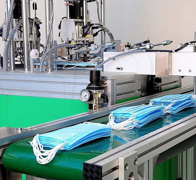 該產線實現平面口罩的全自動化生產,主要包含卷材上料、折疊壓合、鼻梁筋上料、口罩成型、口罩切斷、耳帶上料及焊接、成品下料等工藝,完成從卷料原材料到口罩成品的整個生產過程,生產的口罩具有佩戴舒適,無壓迫感,口罩過濾效果好,契合人的臉型,可適用于醫療、電子、礦業、建筑等行業。